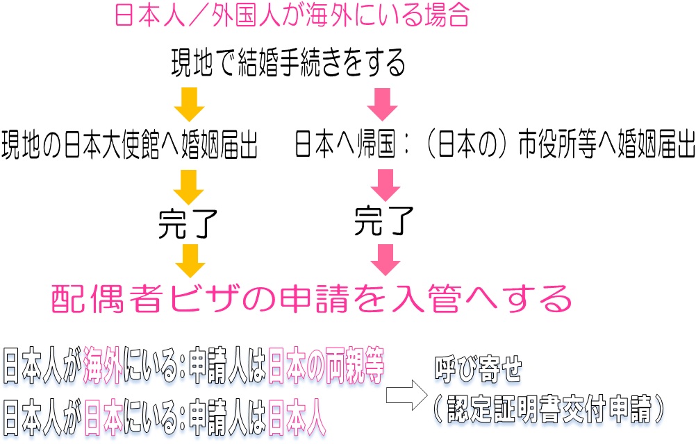配偶者ビザの申請は、お相手の外国人が日本に住んでいるか、海外に住んでいるかで「申請できる人」が変わります。