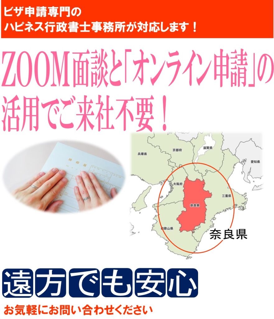 弊所ではオンライン申請を活用し、ZOOM等のオンラインでのご相談とメールや郵送での書類のご対応にて、ご来所いただくても配偶者ビザの申請までをサポートしております。奈良県からもお気軽にお問い合わせください。