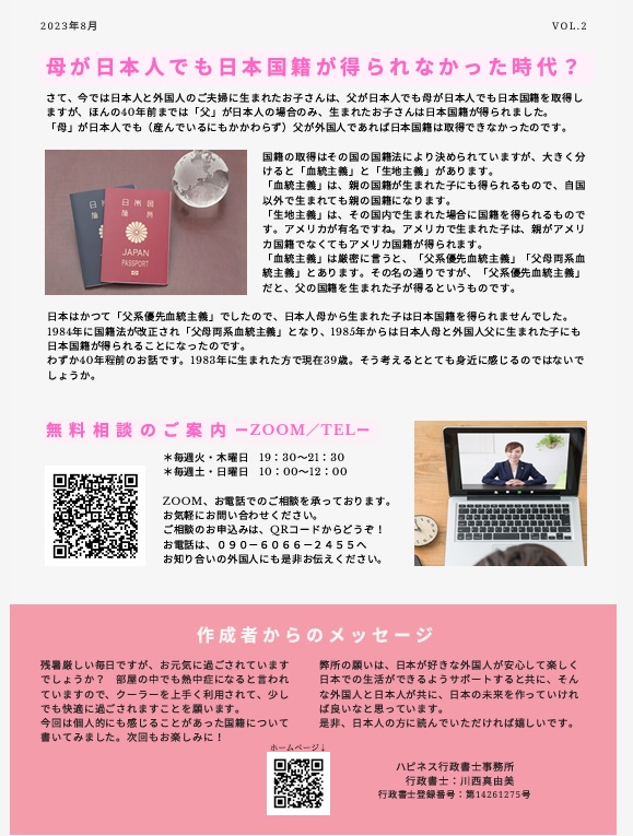 さて、今では日本人と外国人のご夫婦に生まれたお子さんは、父が日本人でも母が日本人でも日本国籍を取得しますが、ほんの40年程前までは「父」が日本人の場合のみ、生まれたお子さんは日本国籍が得られました。