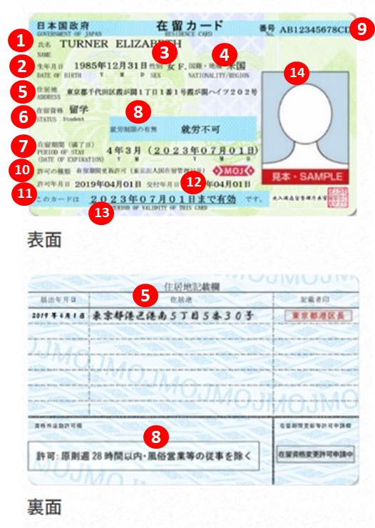 在留カードには以下の14項目が記載されています。