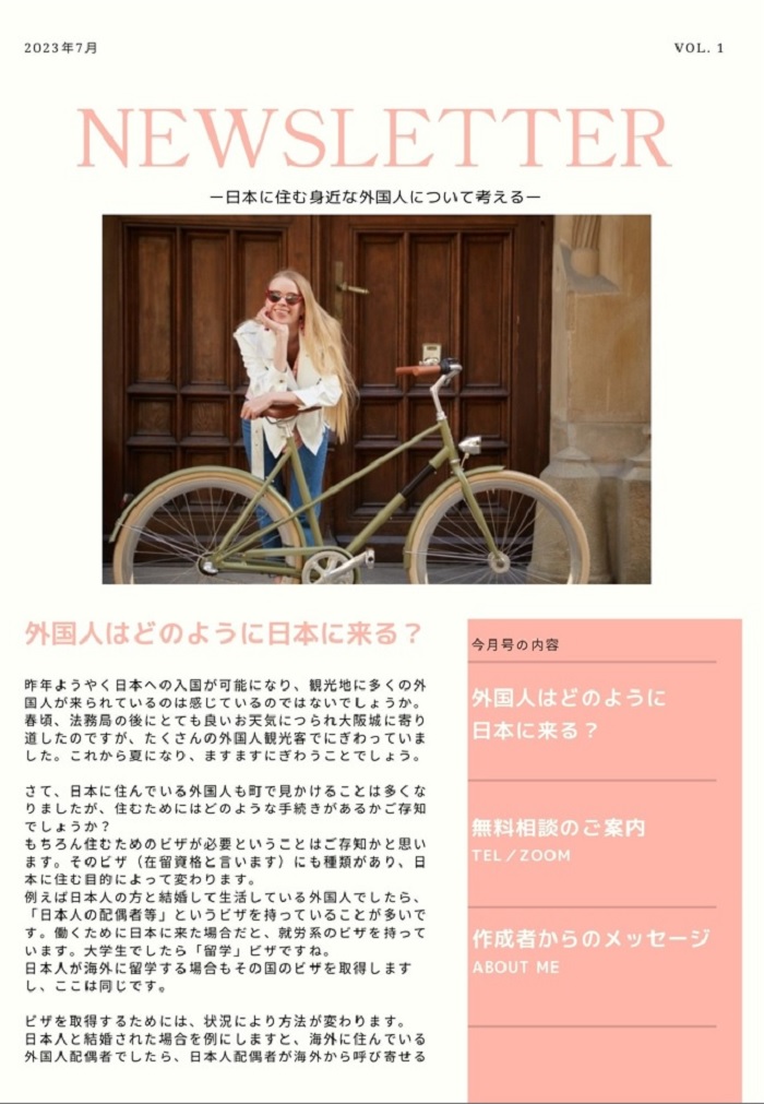 外国人の方が日本に住むには色々と制限があります。これは当然のことですが、日本が好きな外国人が安心して楽しく、日本での生活ができるようサポートすると共に、そんな外国人と日本人が共に、日本の未来を作っていければ良いなと思っています。